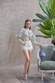 Seashell corseted ruched dress with Leg-O-Mutton sleeves  accentuated with hand embroidery.