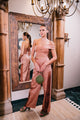 Rosewood bomber jacket with fabric-manipulated sleeves paired with a corset and rosewood panelled pants