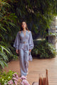 Seashell corseted jumpsuit with voluminous sleeves accentuated with hand embroidery paired with organza panelled pants.